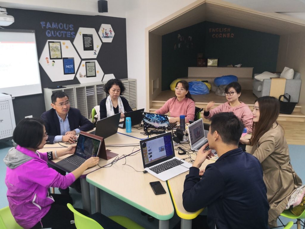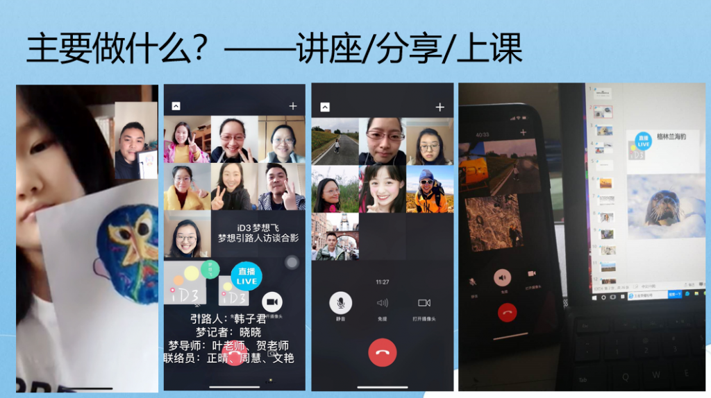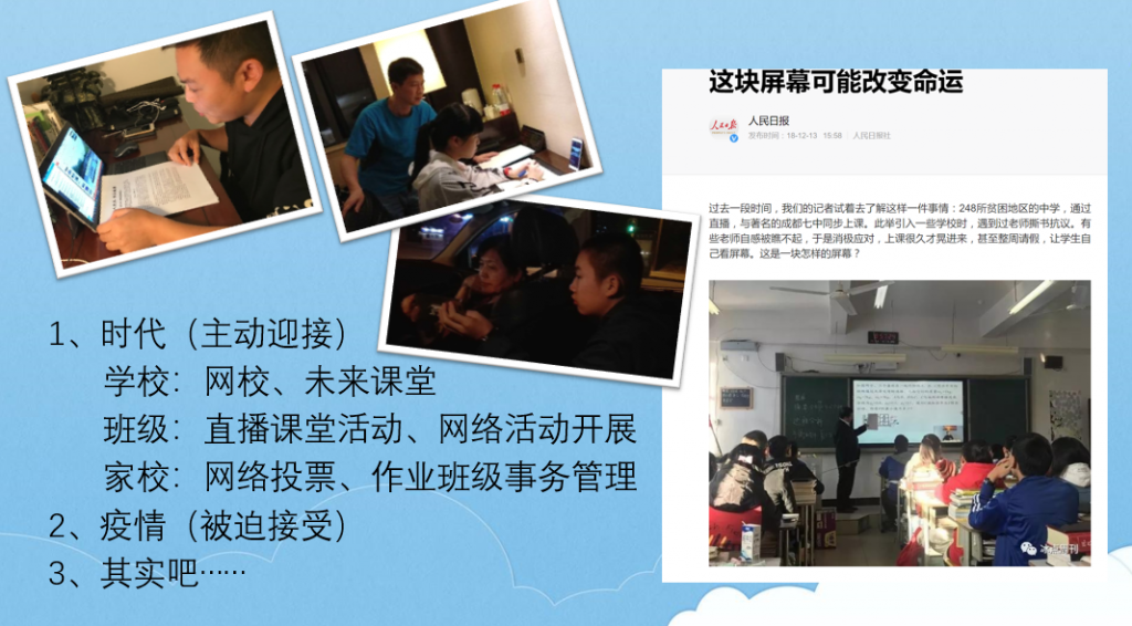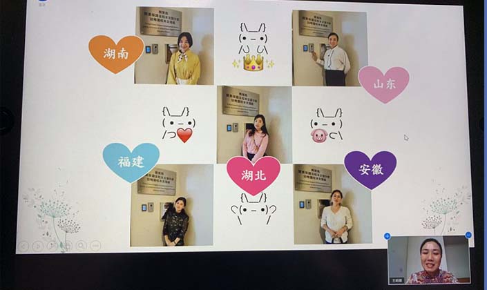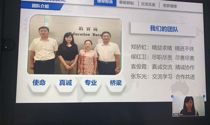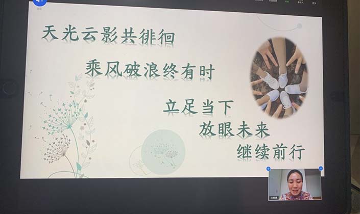 在簡單而有心思的線上為交流教師頒發『榮譽證書』和『感謝狀』後,進入到各組交流教師分享總結的『重頭戲』。語文組張曉巍、苗琳老師;小數組武思仙老師;幼教組王明輝老師;中學組葉德元老師、侯紅衛老師分別進行了分享。