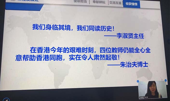 分享會的最後,香港教育研究發展中心為內地交流教師送上了一段視頻。一張張滑過的照片,記錄了內師們在港一年的點滴。一次次難忘的瞬間,被照片勾起,讓人不禁濕了眼眶。發展中心詹華軍總監動情地分享,這一屆老師最特殊最不平凡最不容易,經歷的挑戰是前所未有、最多最艱難。內師們就如武林高手,身兼少林、武當兩大派之所長,內外兼修,既擁有內地優秀的教育教學經驗,又掌握了香港先進的教育教學理念。尤其是這一屆的內師,經歷了香港黑暴和新冠疫情的洗禮和磨礪,更是特別能戰鬥。